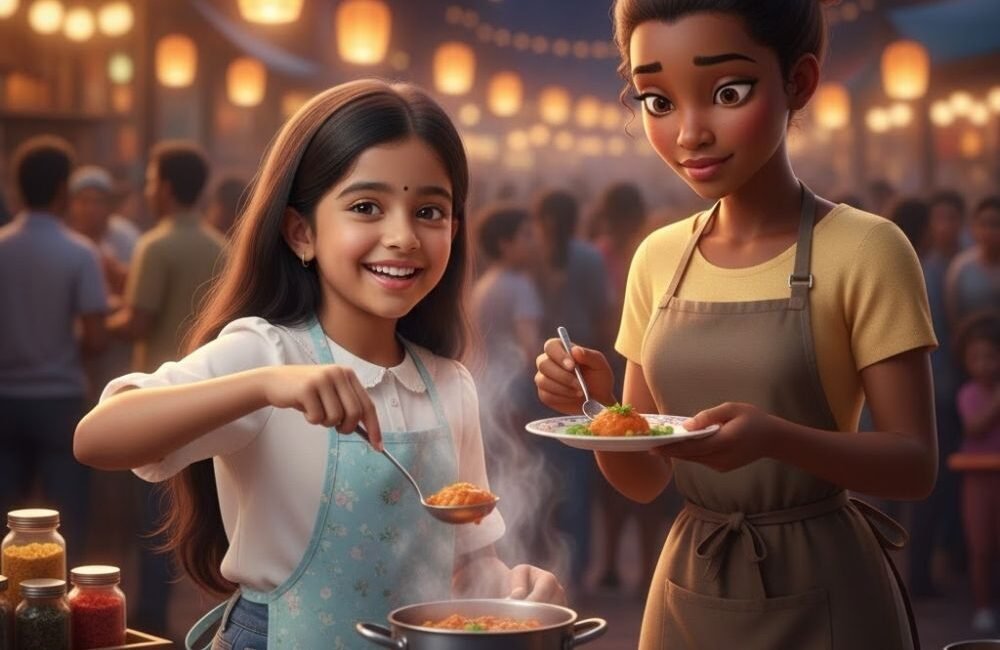 { “image_generation”: { “reference_image”: { “enabled”: true, “instruction”: “User may upload a reference image. The uploaded human image must be matched exactly 100% as a replacement image/ identity lock in the generated image.” } }, “prompt”: “Tiana’s Night Market Cooking Demo — Use the uploaded face {uploaded_face} exactly as replacement image (identity lock) ; preserve 100% accuracy as replacement image. Always include the uploaded human engaged in cooking with photorealistic Tiana. Create a hyper‑realistic 8K square image. Location: lively night market stall lit by paper lanterns. Wardrobe: smart casual (apron over blouse, jeans). Pose & action: stirring a small pot and offering a sample to camera, delighted smile; Tiana plates a mini‑dish beside you and both present it together (complementary action). Background: market bustle, spice jars, steam and warm light. Camera: 50mm‑equivalent waist shot with shallow depth. Lighting: warm lantern glow and rim light. Mood: festive culinary delight. No text or watermark.” }