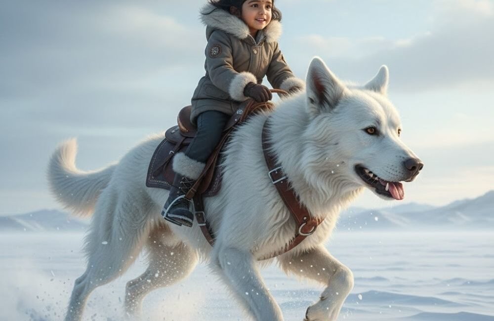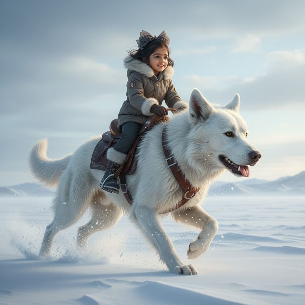 { "image_generation": { "reference_image": { "enabled": true, "instruction": "User may upload a reference image. The uploaded human image must be matched exactly 100% as a replacement image / identity lock in the generated image." } }, "prompt": "Use the uploaded face {uploaded_face} exactly as replacement image (identity lock); preserve 100% accuracy as replacement image. Create a hyper‑realistic, cinematic 8K square image. Scene: frozen tundra with low pale light and wind‑blown snow. Main subject: a huge arctic wild dog bounding across snowdrifts with breath visible, padded saddle for cold travel. Human character: bundled in warm layers. Pose & action: foxhound‑style bounding with snow spray trailing behind. Camera: eye‑level cinematic shot, fast‑freeze detail, 35mm‑equivalent lens. Lighting: cold blue ambient with warm rim highlights. Mood: brisk, buoyant motion. Style: photorealistic, ultra‑detailed textures, realistic proportions. No text, no watermark, no logos." }
