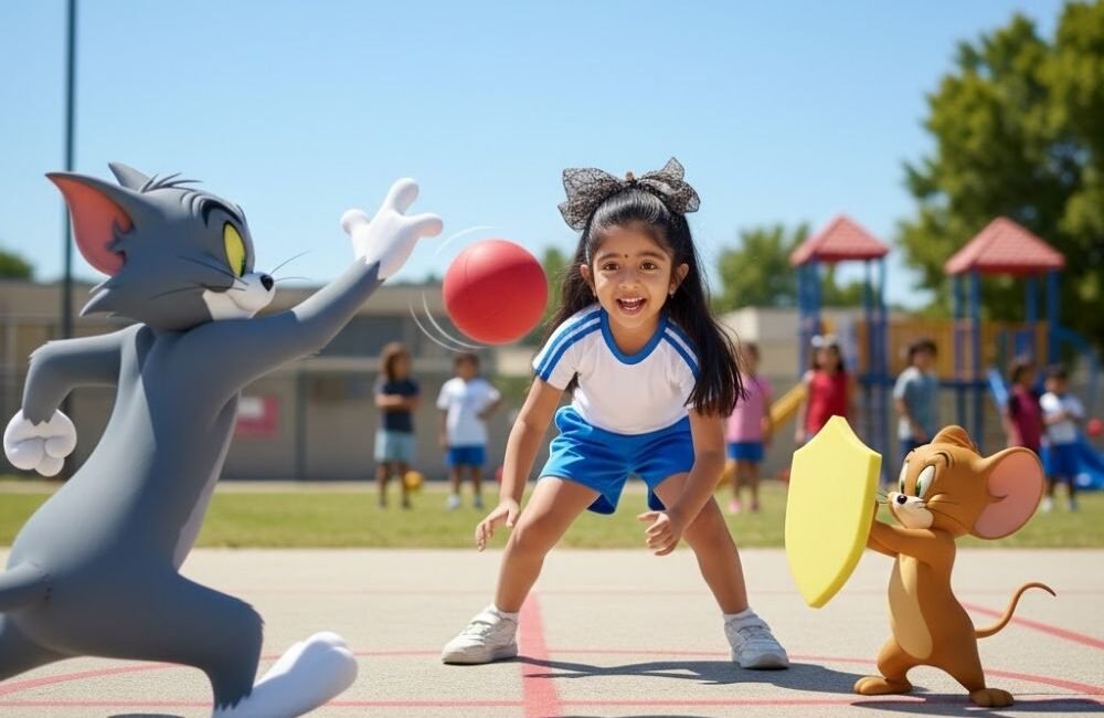 Aanya with Tom and Jerry at Dodgeball Playground Fun