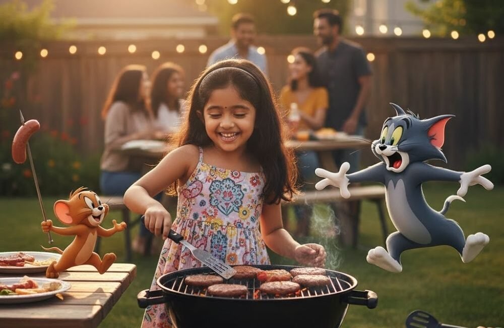 { “image_generation”: { “reference_image”: { “enabled”: true, “instruction”: “User may upload a reference image. The uploaded human image must be matched exactly 100% as a replacement image/ identity lock in the generated image.” } }, “prompt”: “Tom & Jerry — Backyard BBQ Mayhem — Use the uploaded face {uploaded_face} exactly as replacement image (identity lock) ; preserve 100% accuracy as replacement image. Always include the uploaded human hosting a BBQ with photorealistic Tom and Jerry. Create a hyper‑realistic 8K square image. Location: suburban backyard with grill and string lights. Wardrobe: casual weekend look (polo shirt or sundress, shorts). Pose & action: flipping burgers at the grill with a playful grin; Jerry steals a sausage on a skewer while Tom leaps from the table—your posture matches the surprise and laughter (complementary action). Background: guests, picnic table, soft bokeh. Camera: 50mm‑equivalent medium shot. Lighting: golden hour with warm rim. Mood: festive, chaotic fun. No text or watermark.” }