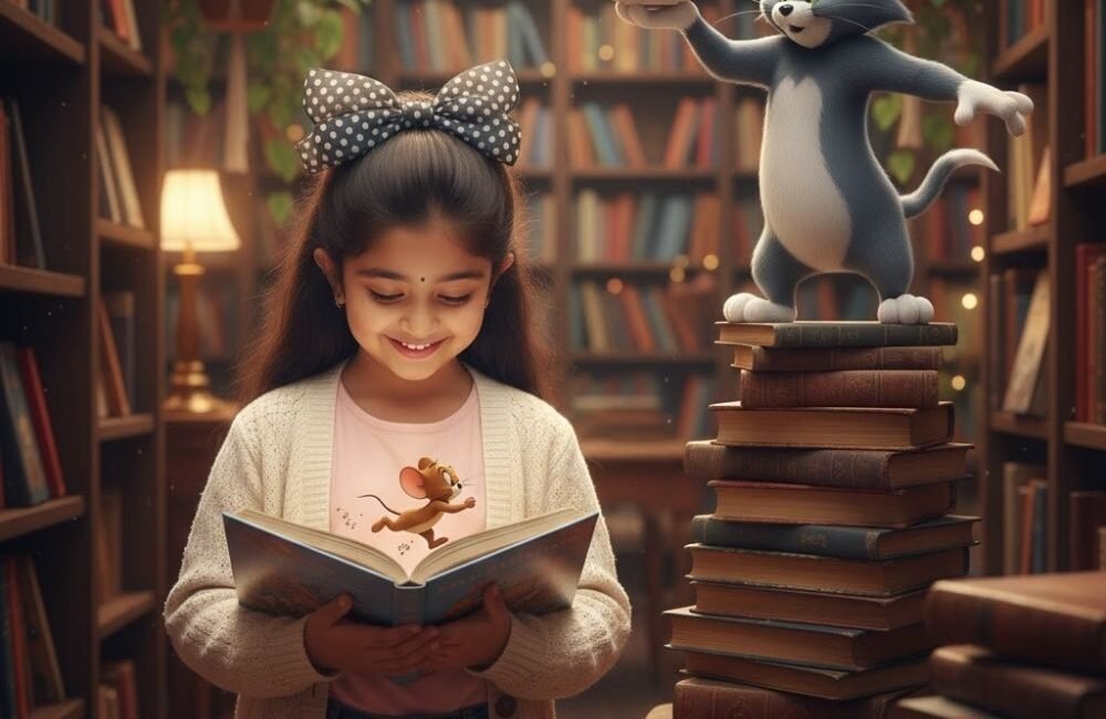{ “image_generation”: { “reference_image”: { “enabled”: true, “instruction”: “User may upload a reference image. The uploaded human image must be matched exactly 100% as a replacement image/ identity lock in the generated image.” } }, “prompt”: “Tom & Jerry — Bookshop Quiet Chaos — Use the uploaded face {uploaded_face} exactly as replacement image (identity lock) ; preserve 100% accuracy as replacement image. Always include the uploaded human browsing with photorealistic Tom and Jerry. Create a hyper‑realistic 8K square image. Location: cosy independent bookshop. Wardrobe: smart casual (cardigan, scarf). Pose & action: standing with a stack of books, smiling as you read a blurb; Jerry sprints across the open pages and Tom balances a teacup on a stack of books—your amused concentration complements the subtle mayhem (complementary action). Background: shelves, warm lamps, hanging plants. Camera: 50mm-equivalent mid-shot, shallow depth. Lighting: warm indoor light. Mood: bookish charm with comedy. No text or watermark.” }