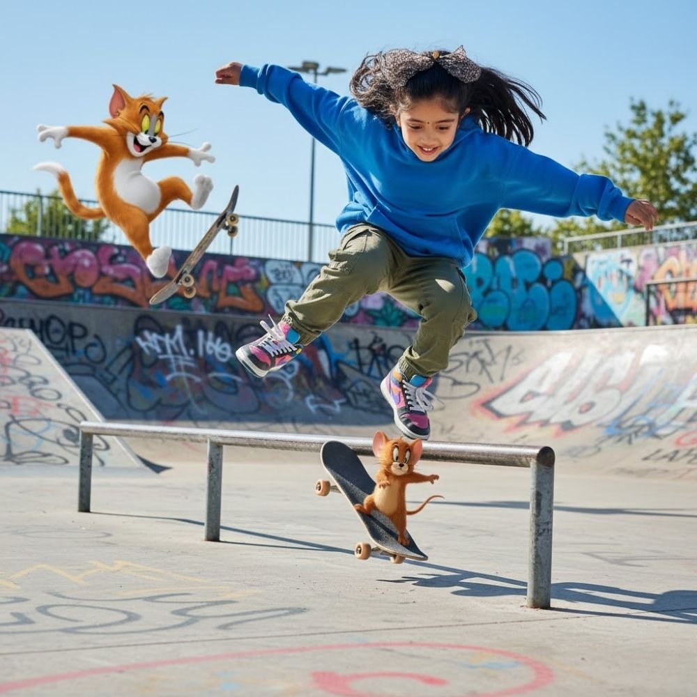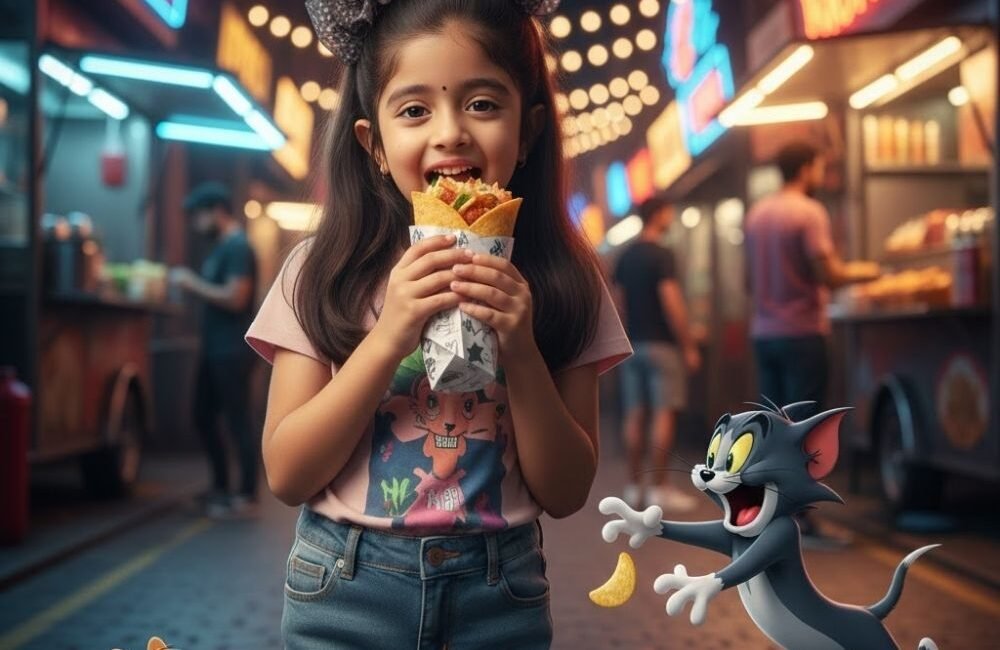 { “image_generation”: { “reference_image”: { “enabled”: true, “instruction”: “User may upload a reference image. The uploaded human image must be matched exactly 100% as a replacement image/ identity lock in the generated image.” } }, “prompt”: “Tom & Jerry — Gourmet Street‑Food Bite — Use the uploaded face {uploaded_face} exactly as replacement image (identity lock) ; preserve 100% accuracy as replacement image. Create a hyper‑realistic 8K square image. Location: trendy street‑food lane with food trucks. Wardrobe: urban casual (graphic tee, denim). Pose & action: holding a wrapped gourmet taco mid‑bite, eyes smiling. Activity: photorealistic Jerry samples a fallen crumb while Tom tries to snatch a dropped chip—your bite and their scavenging complement one another (complementary action). Background: neon truck signs, evening crowd. Camera: 35–50mm‑equivalent close mid‑shot. Lighting: mixed neon and warm food lights. Mood: urban tasty fun. No text or watermark.” }