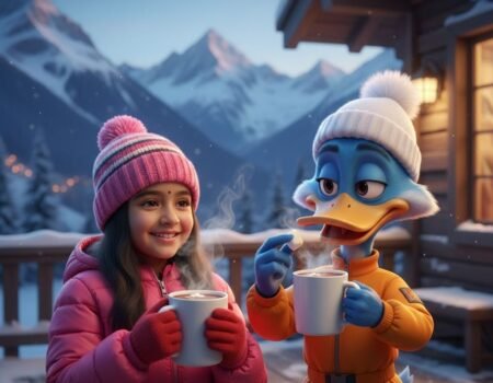 Aanya with Duck on ski lodge terrace