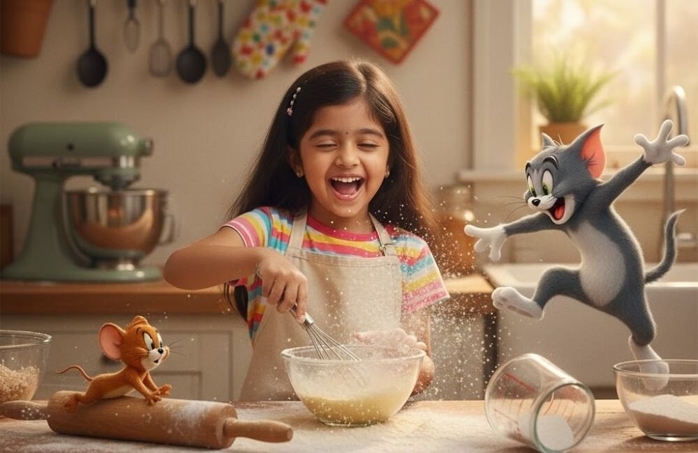 { “image_generation”: { “reference_image”: { “enabled”: true, “instruction”: “User may upload a reference image. The uploaded human image must be matched exactly 100% as a replacement image/ identity lock in the generated image.” } }, “prompt”: “Tom & Jerry — Kitchen Slapstick Baking — Use the uploaded face {uploaded_face} exactly as replacement image (identity lock) ; preserve 100% accuracy as replacement image. Always include the uploaded human working with photorealistic Tom and Jerry. Create a hyper‑realistic 8K square image. Location: bright home kitchen with flour‑dusted counters and baking tools. Wardrobe: casual home wear (apron over tee). Pose & action: standing at counter stirring batter, laughing as flour cloud puffs; Jerry rides a rolling pin across the counter while Tom chases, knocking over a measuring cup—your reaction coordinates with the chaos (complementary action). Background: oven mitts, hanging utensils, warm kitchen light. Camera: 35–50mm‑equivalent mid‑shot with shallow depth; subtle motion blur on rolling pin. Lighting: warm indoor key with soft fill. Mood: comedic, homey. No text or watermark.” }