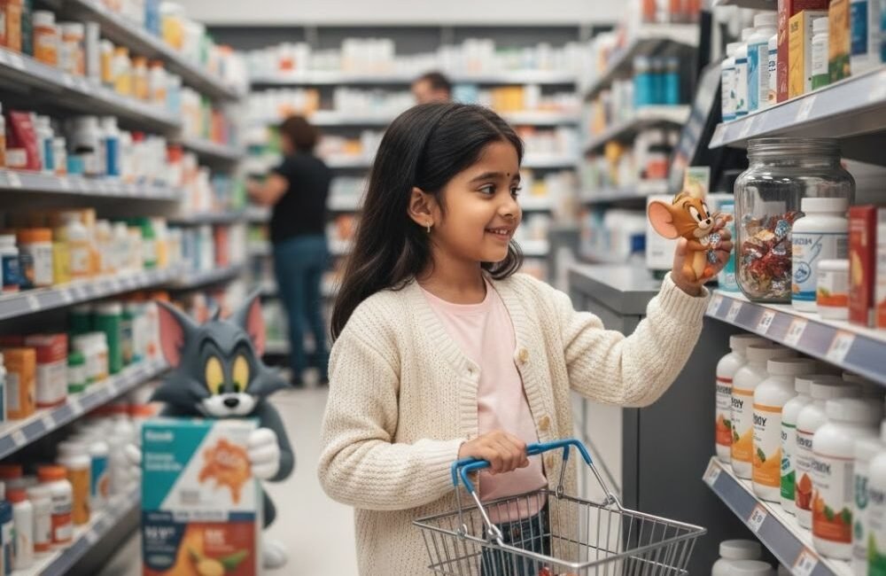 { “image_generation”: { “reference_image”: { “enabled”: true, “instruction”: “User may upload a reference image. The uploaded human image must be matched exactly 100% as a replacement image/ identity lock in the generated image.” } }, “prompt”: “Tom & Jerry — Pharmacy Coupon Hustle — Use the uploaded face {uploaded_face} exactly as replacement image (identity lock) ; preserve 100% accuracy as replacement image. Always include the uploaded human shopping with photorealistic Tom and Jerry. Create a hyper‑realistic 8K square image. Location: bright local pharmacy with product aisles. Wardrobe: everyday casual (tee, cardigan, jeans). Pose & action: holding a small basket scanning items, amused frown; Jerry steals a tiny candy from the checkout jar while Tom hides behind a display of vitamin bottles—your patient smile complements the sneaky duo (complementary action). Background: shelves of health products, checkout area. Camera: 35mm-equivalent mid-shot. Lighting: neutral store lighting with soft rim. Mood: light, domestic comedy. No text or watermark.” }